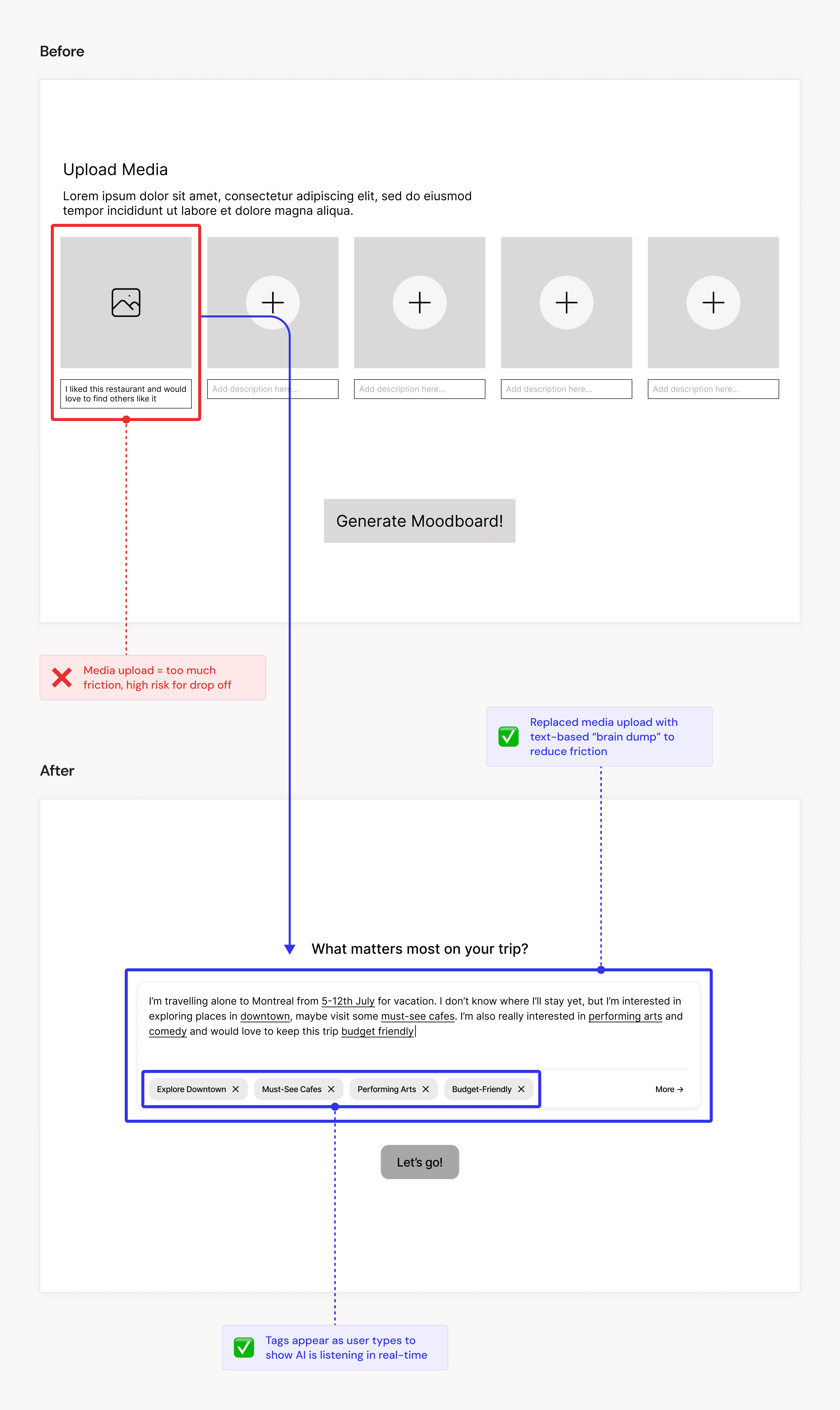 ✅ Improved iteration: Replaced media upload with a text-based input step where users can “brain dump” their trip vision to reduce onboarding friction