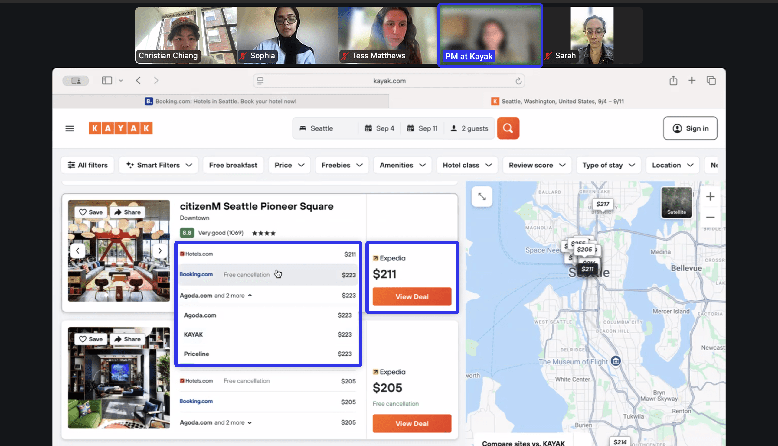 To build on generative research and ground design strategy in real business considerations, we reached out to a Product Manager at Kayak who agreed to consult with us throughout the project. He introduced us to Kayak.ai, a newly beta-launched AI travel planning tool from Kayak, and shared insights about Kayak's commission-based revenue model where the platform earns revenue when users click through to book with partner sites. This helped us understand that our design would need to balance user trust and engagement with clear pathways to booking.