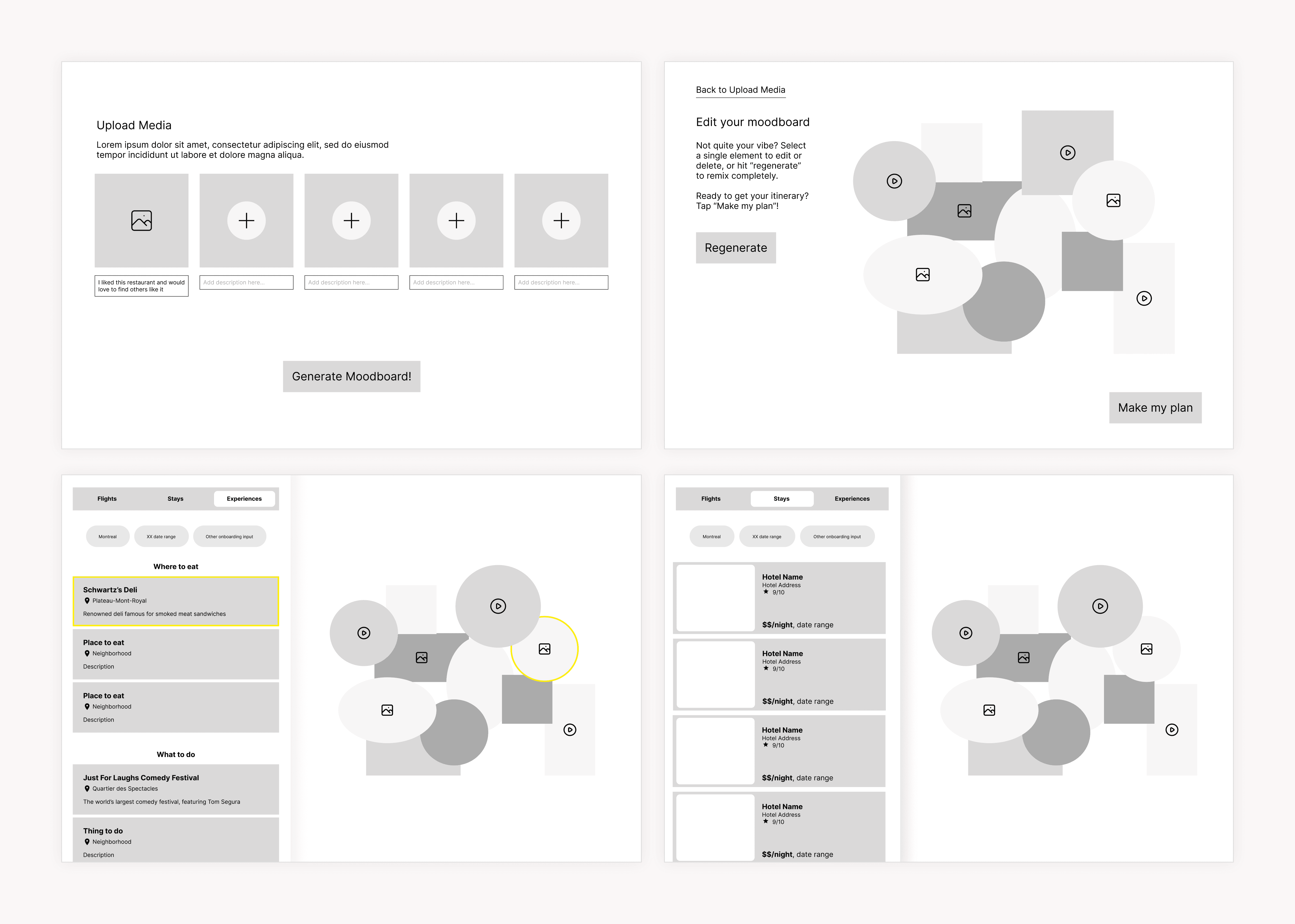 Low fidelity prototypes: onboard by uploading media, AI generates an editable moodboard from onboarding input, user gets personalized travel recs that correspond to moodboard