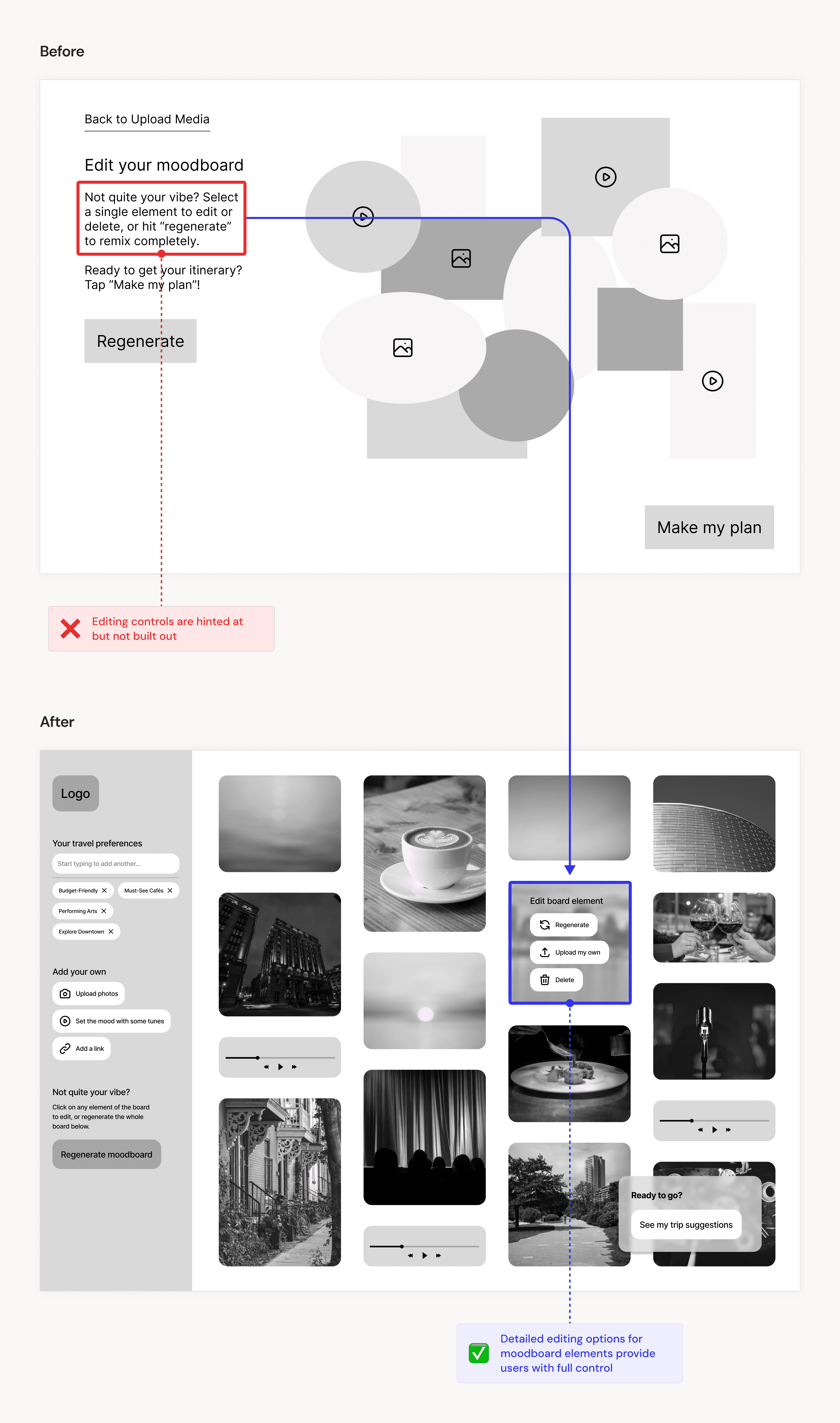 ✅ Improved iteration: Added detailed editing controls: users can hover over any moodboard element to delete it, upload their own media to replace it, or regenerate with AI.
