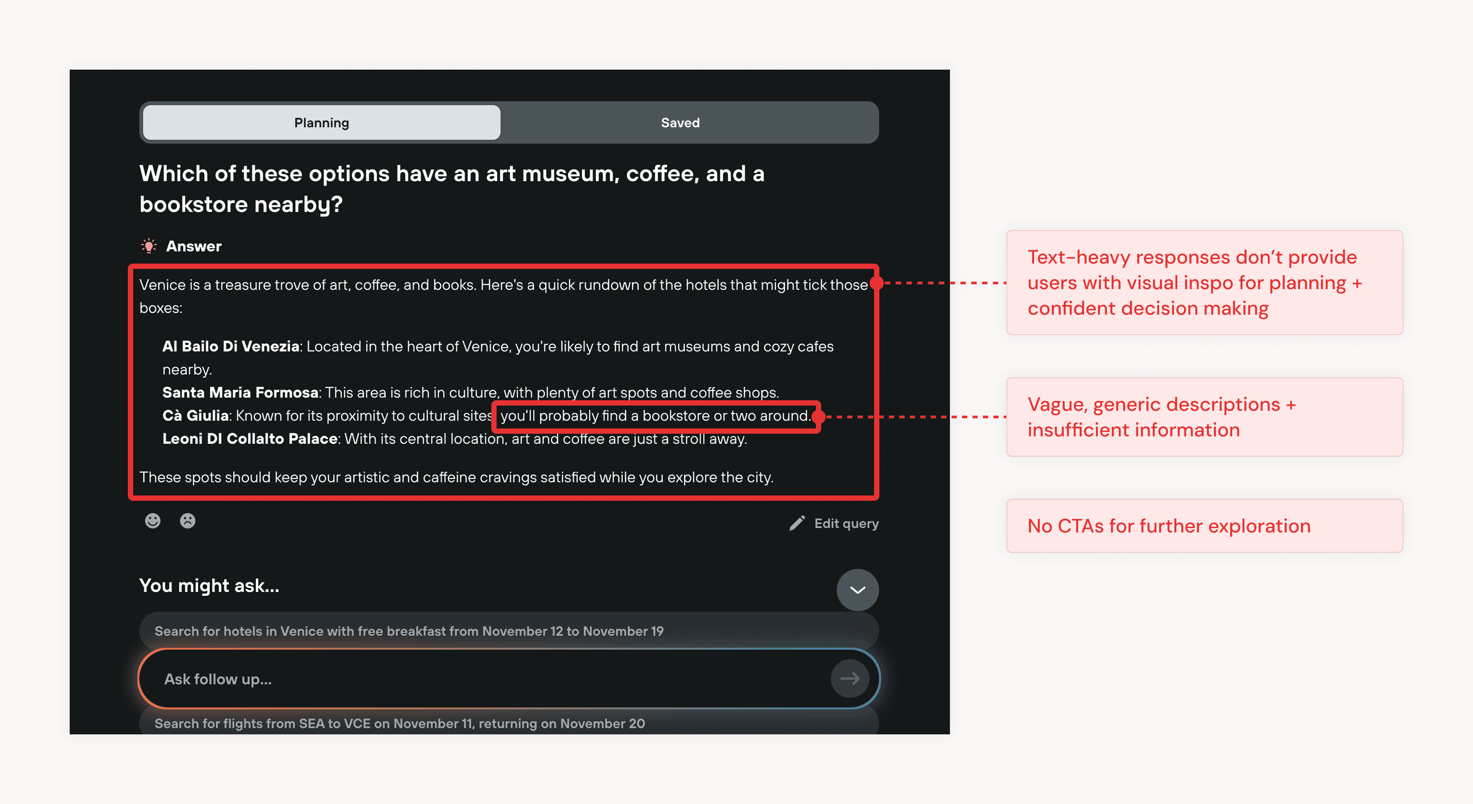 After our meeting, I delved deeper into AI-assisted trip planning and performed a competitive analysis on existing tools - including Kayak.ai - to gain insight into the current landscape and identify opportunities for improvement, keeping in mind our key takeaways from initial research. I found that across the board, they default to text-heavy lists and generic recommendations, rather than provide travelers with visually rich, personalized output they desire when planning.