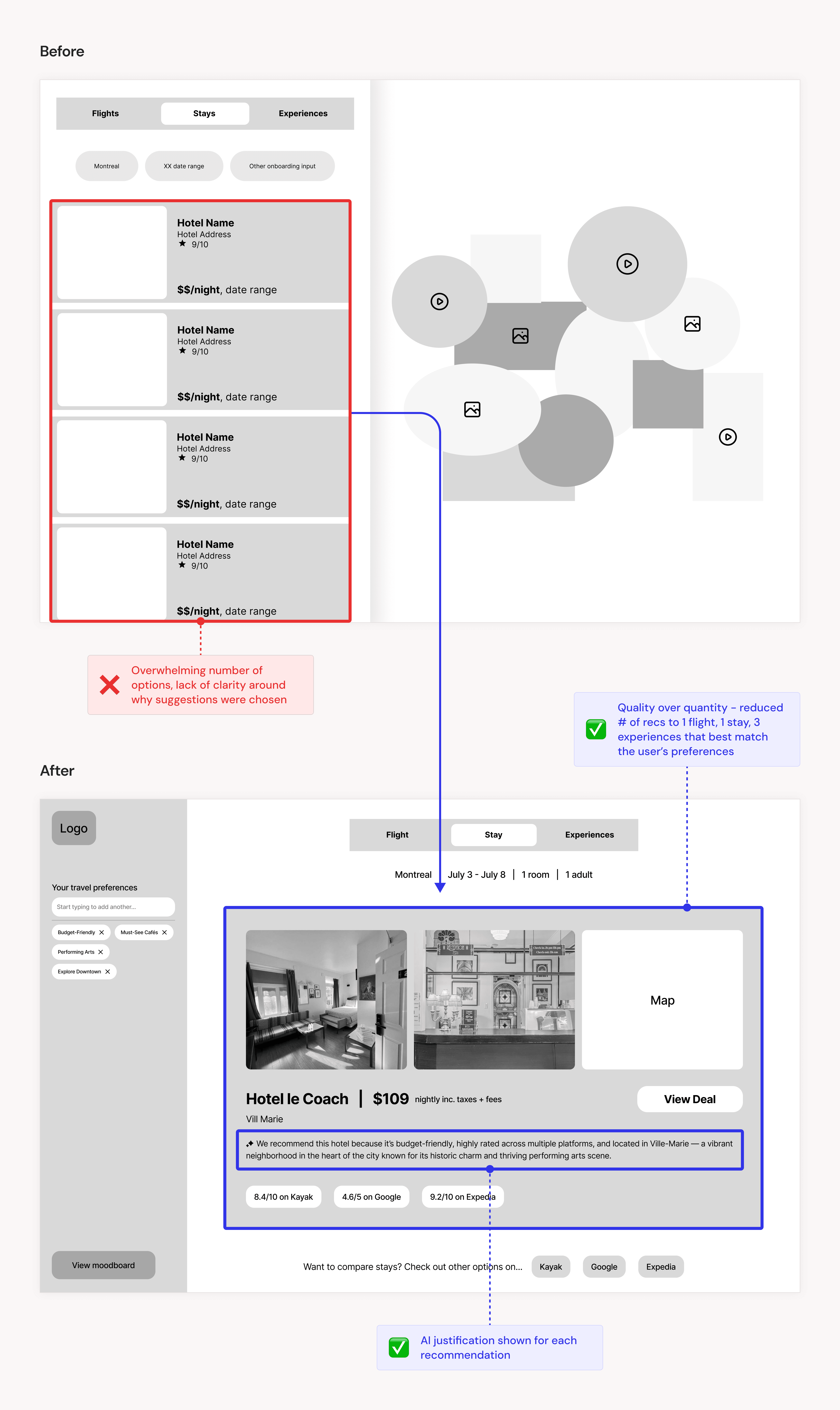 While with our initial prototypes, participants felt overwhelmed by too many AI recommendations, there’s a fine line - by providing only 1 recommended flight, 1 stay, and 3 experiences, they became suspicious that the content being shown to them was sponsored