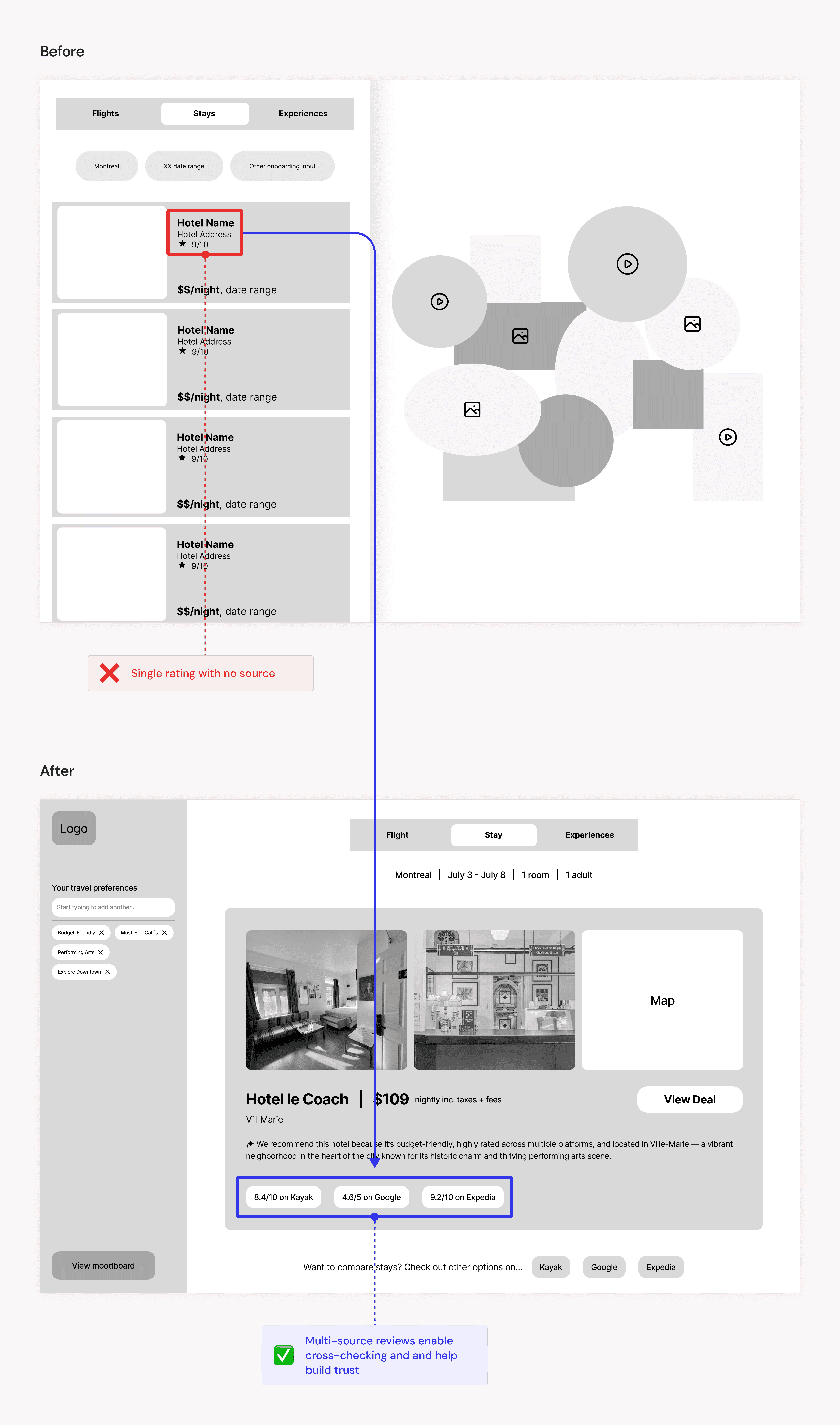 ✅ Improved iteration: Added review aggregation from multiple sources on each recommendation card to enable cross-checking and help build trust. This also aligned with business goals - by positioning Lucid as a comprehensive planning hub where users could research AND book, we increased the likelihood they'd stay on the platform and click through to booking partners.