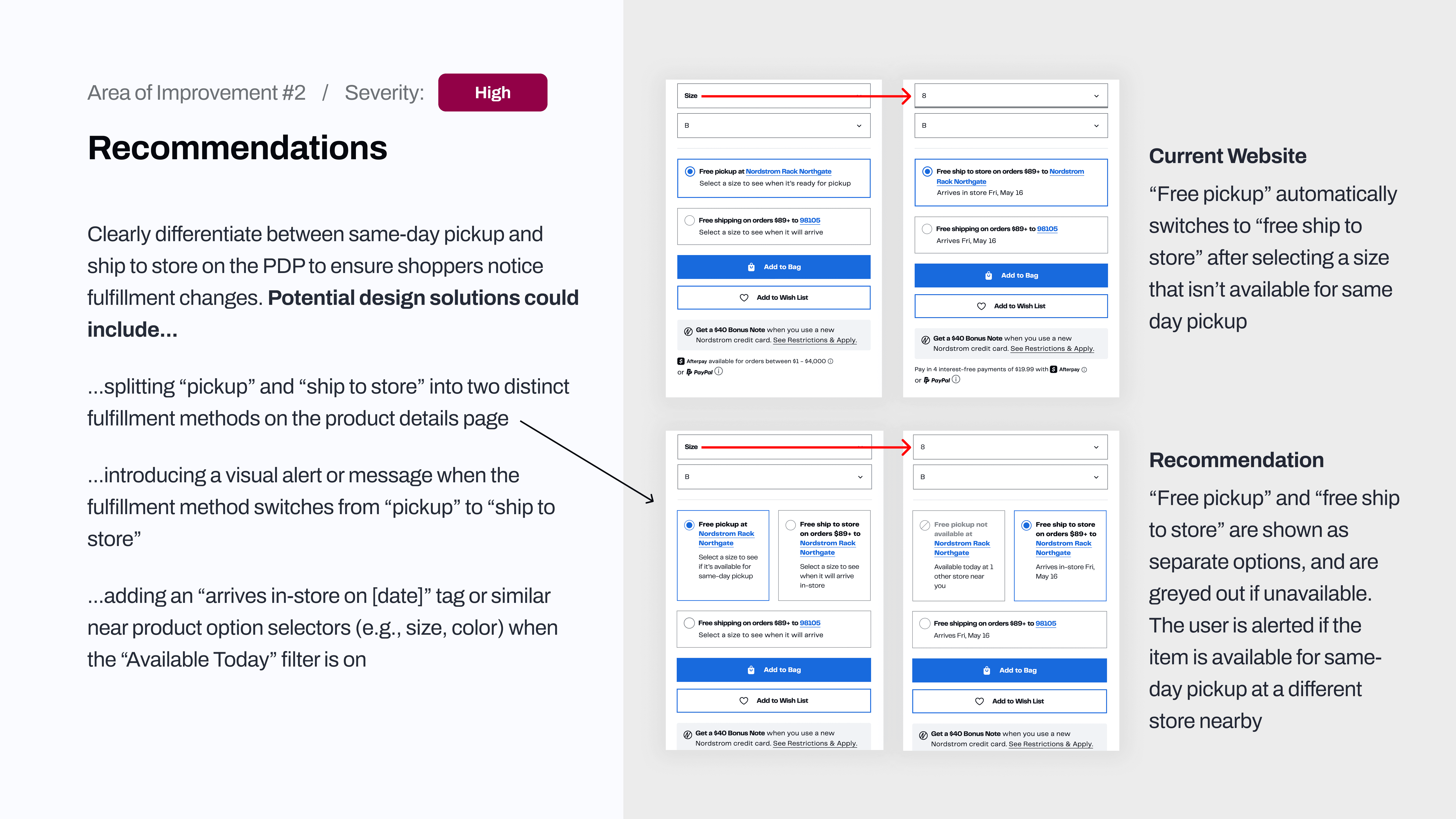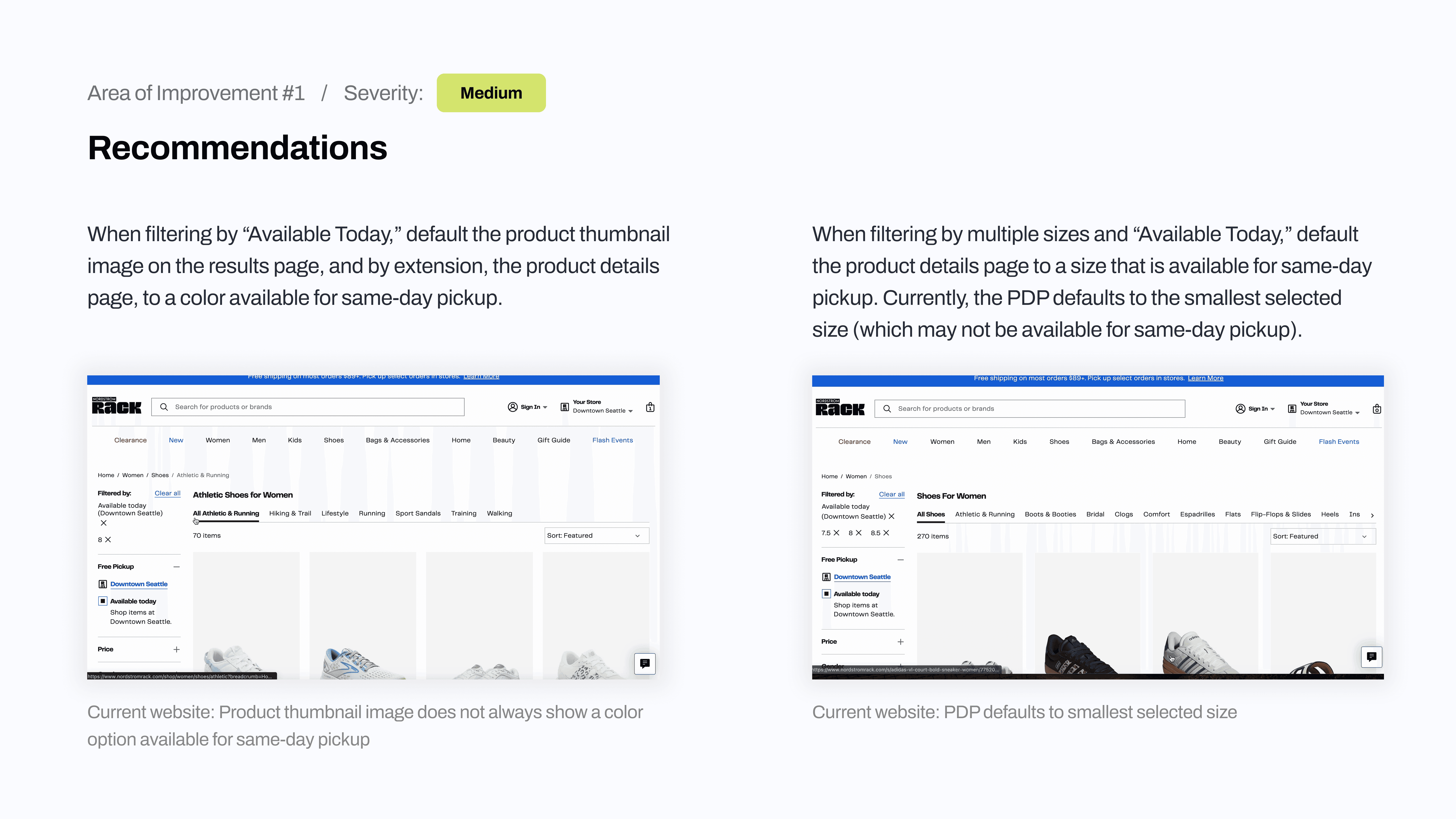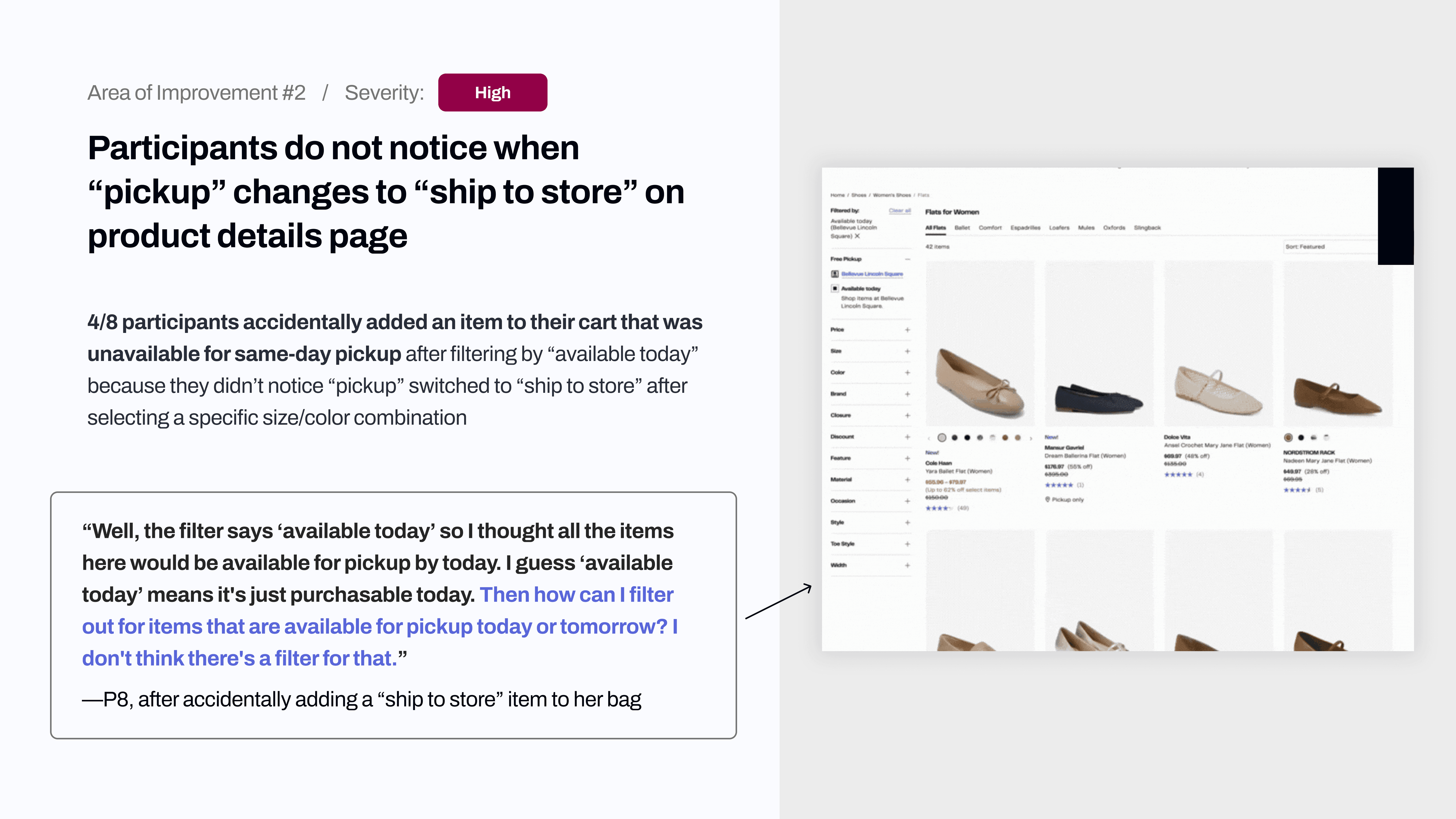 I led weekly check-ins with Nordstrom Rack stakeholders throughout the process, which helped us stay aligned on business goals, understand the context behind existing systems, and build on previous research. For example, our heuristic evaluation revealed a potential issue around purchasing same-day pickup items from multiple store locations. Initially, we weren’t sure if it was worth focusing on, but after a discussion with stakeholders, we learned that while it’s an edge case, it’s one they care about and want to improve. This input directly informed our usability study design and ensured our findings were relevant to the business.