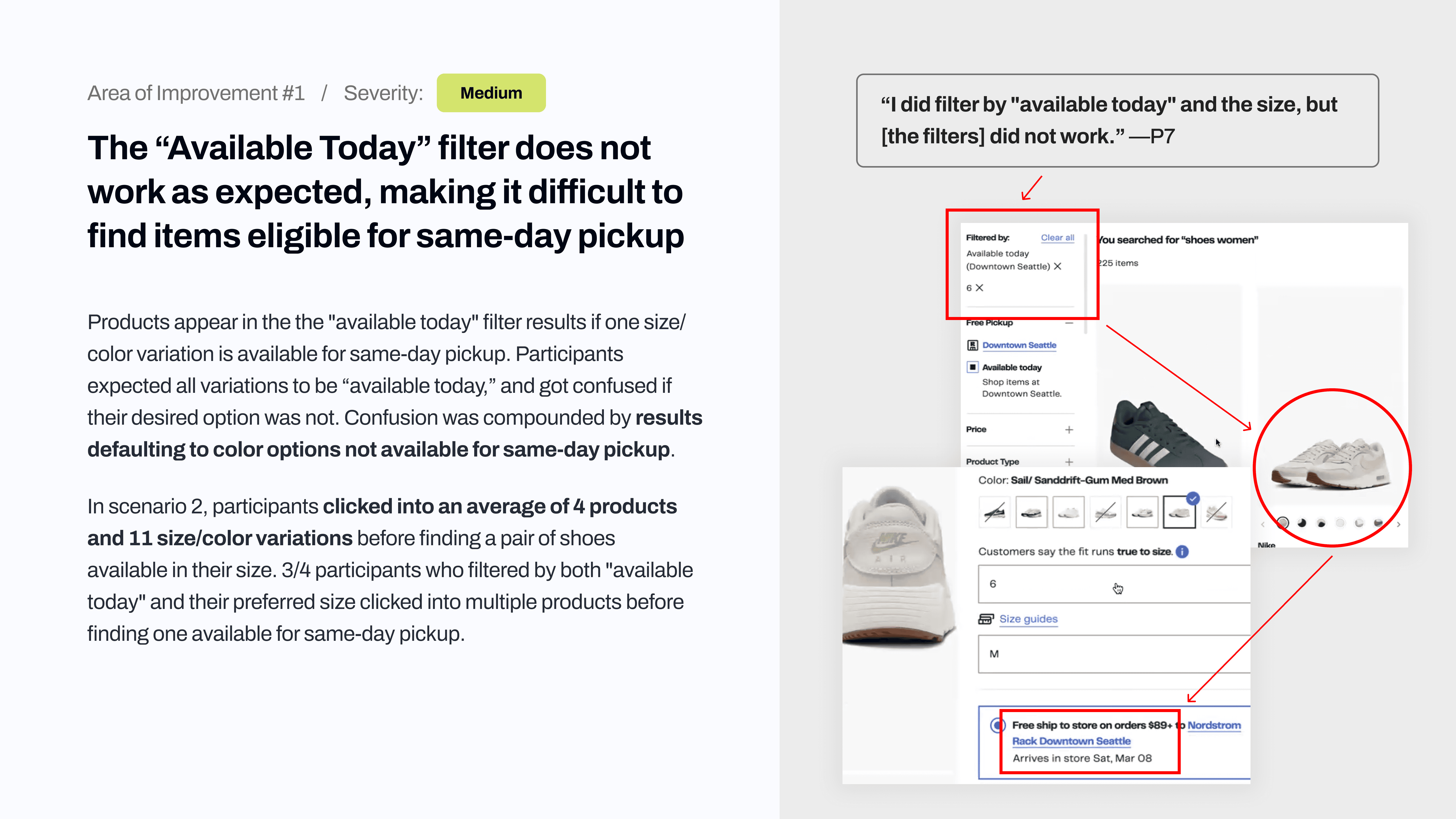 I processed the data (task completion, qualitative feedback via think-aloud protocol, and Likert scale questionnaire answers) from 2/8 participants. From there, my teammates and I conducted thematic analysis to uncover pain points across participants and translate them into findings. After coding and theming our data, it became clear that the most significant issue for participants was a mismatch between their expectations around the “Available Today” filter and how it actually worked, particularly when browsing product categories with multiple sizes or colors per item. Participants incorrectly assumed all item variations shown when using the filter were available for same-day pickup, leading to confusion and errors as they moved through the flow. As such, we made it a priority to highlight this issue in our report to stakeholders.