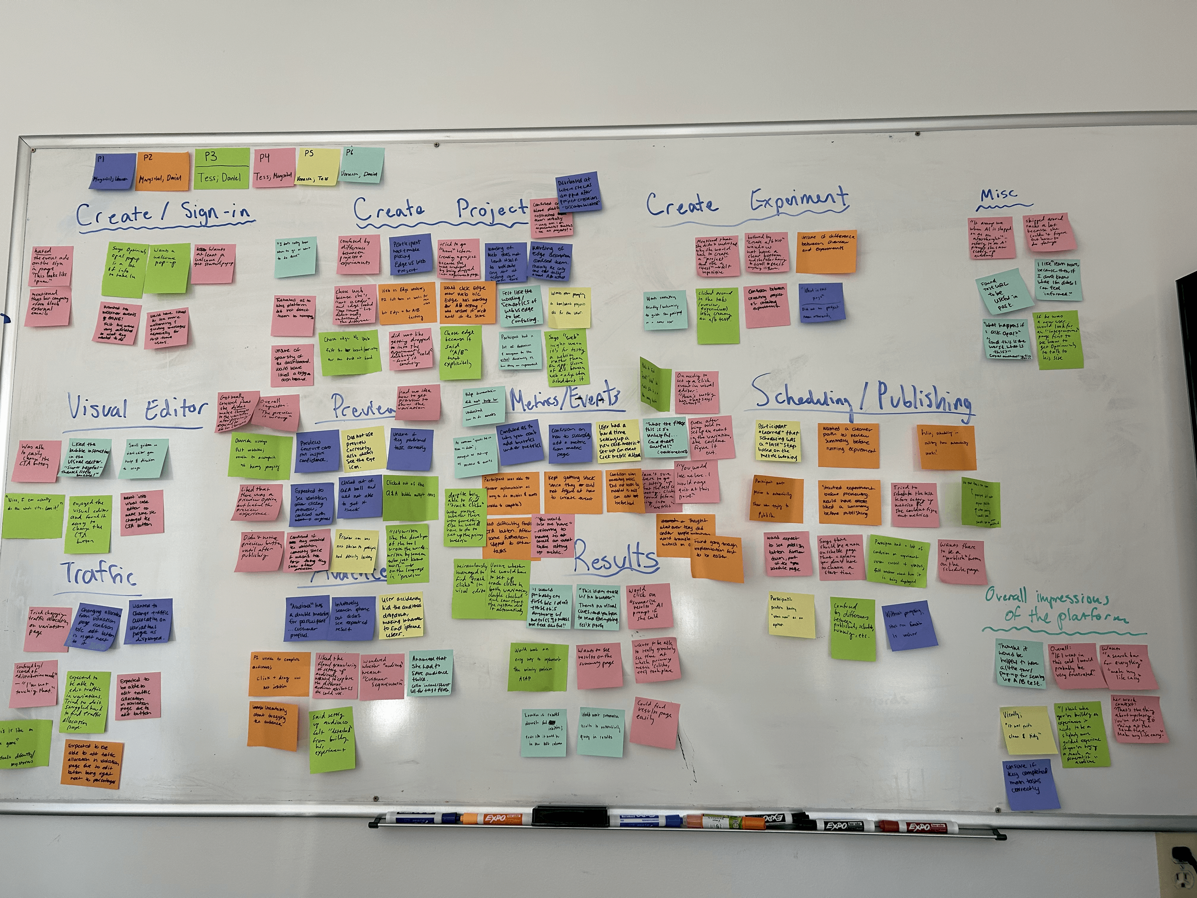 During the usability study, participants played the role of a marketer at an ecommerce company. We had each participant log into WebEx as a new user and set up an A/B test. After many rounds of affinity mapping + synthesis, we distilled our data into 3 key findings.