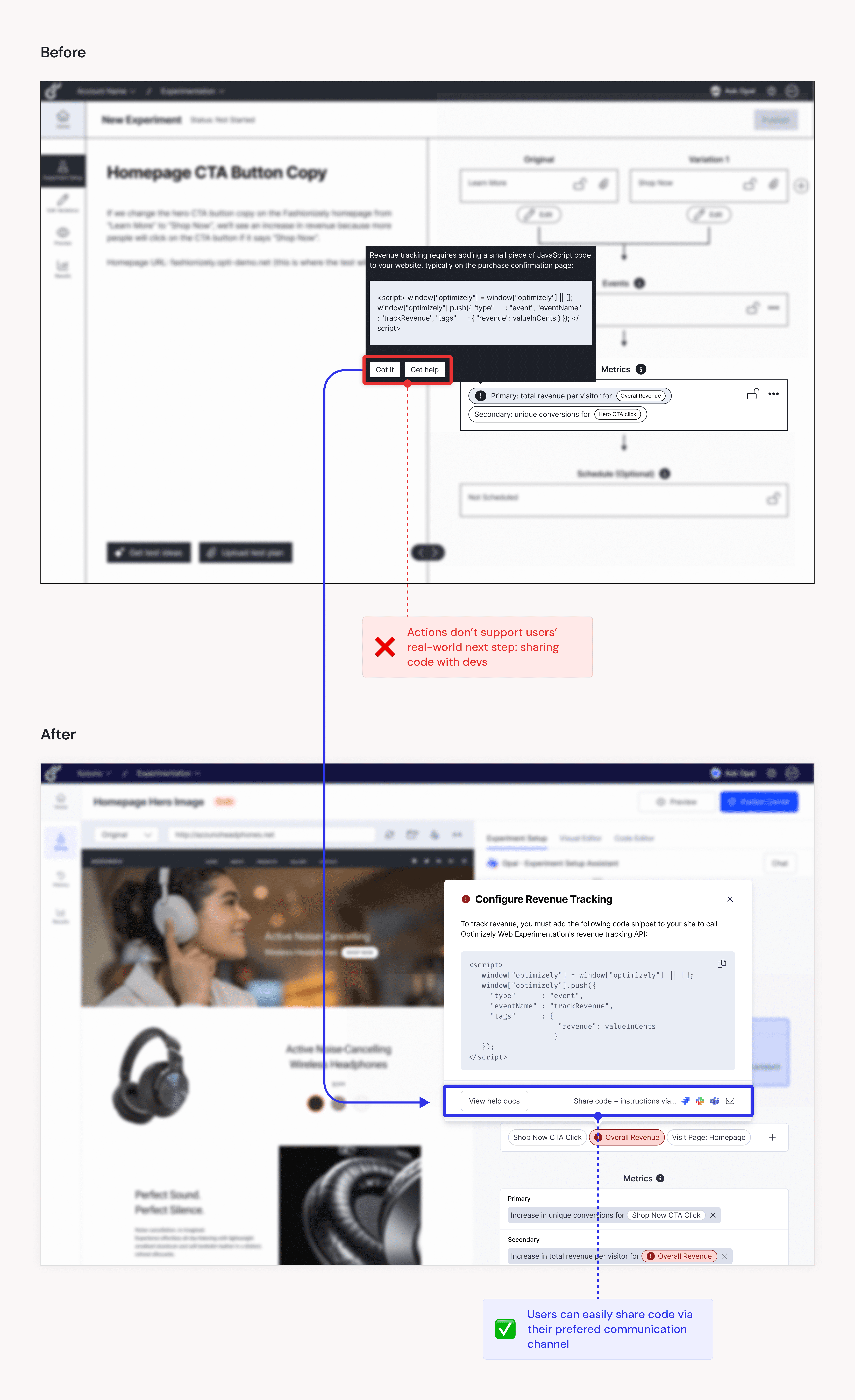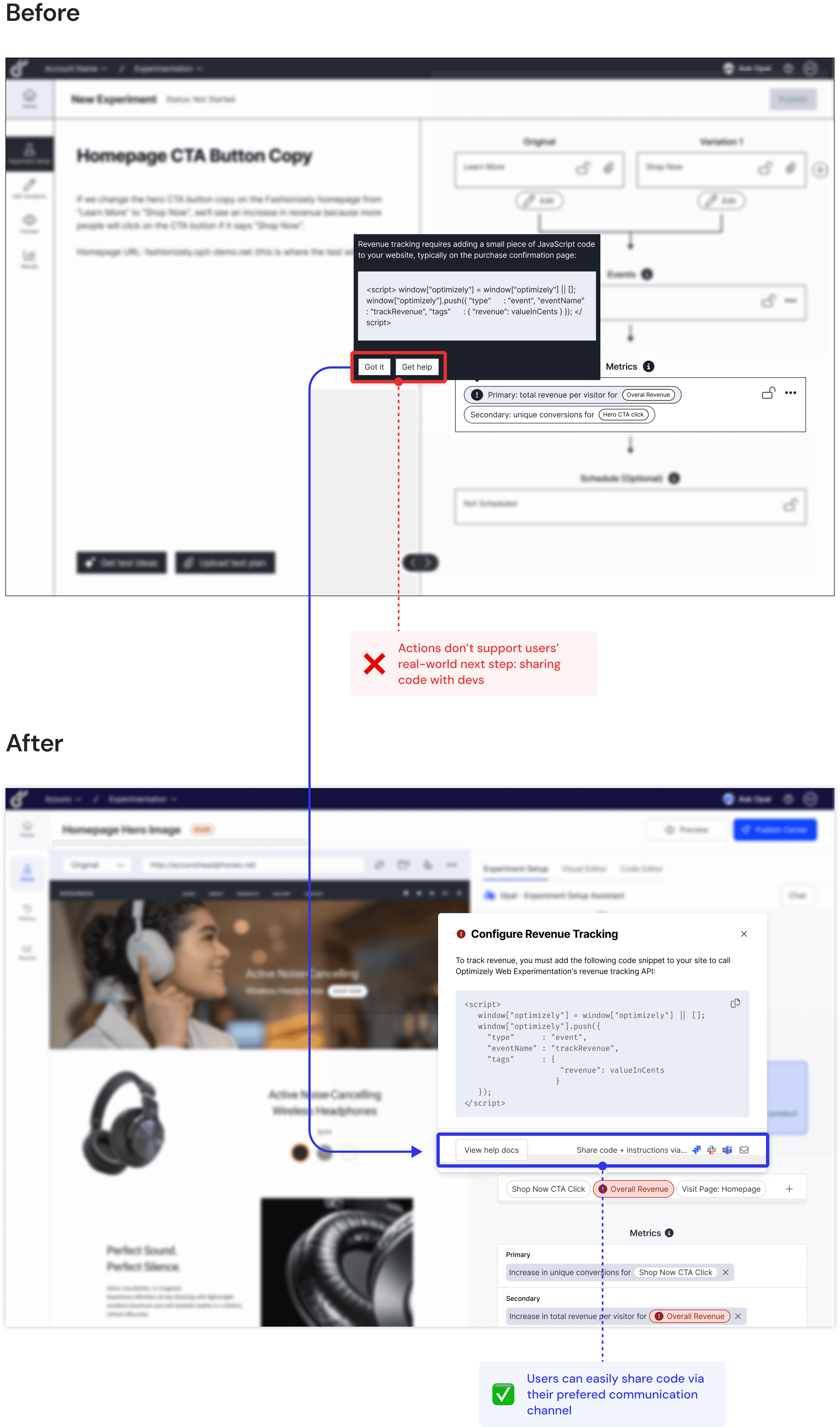 In order for WebEx to track certain metrics, like revenue, a JavaScript snippet must be added to the head code of the website where the A/B test will run. The original WebEx platform doesn’t alert users when additional code is needed, so I added a clear error state + popup in our redesign. While participants noticed and understood the error, they emphasized that implementing additional code would be a major friction point for them as it typically involves reliance on a developer.