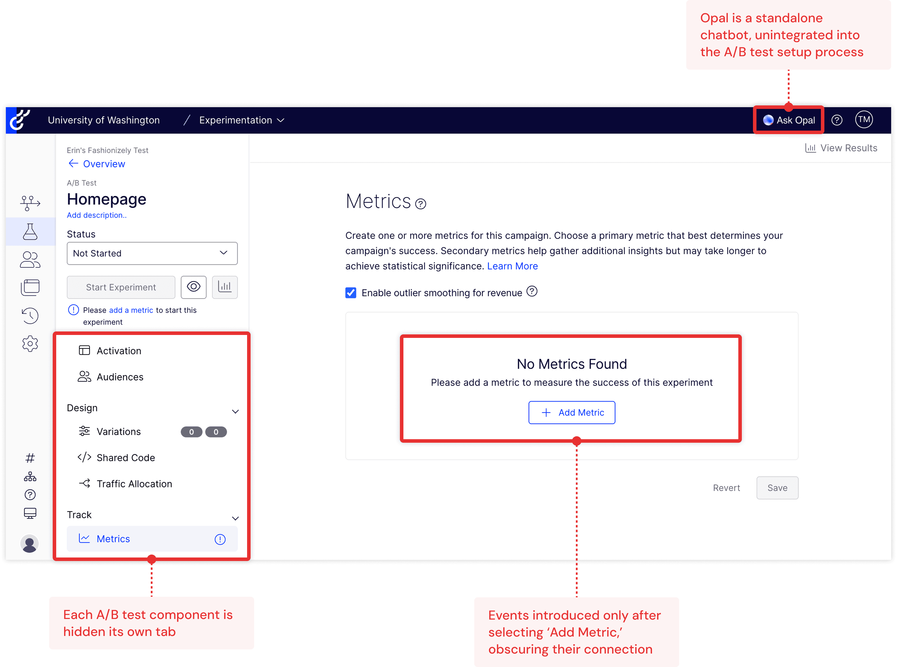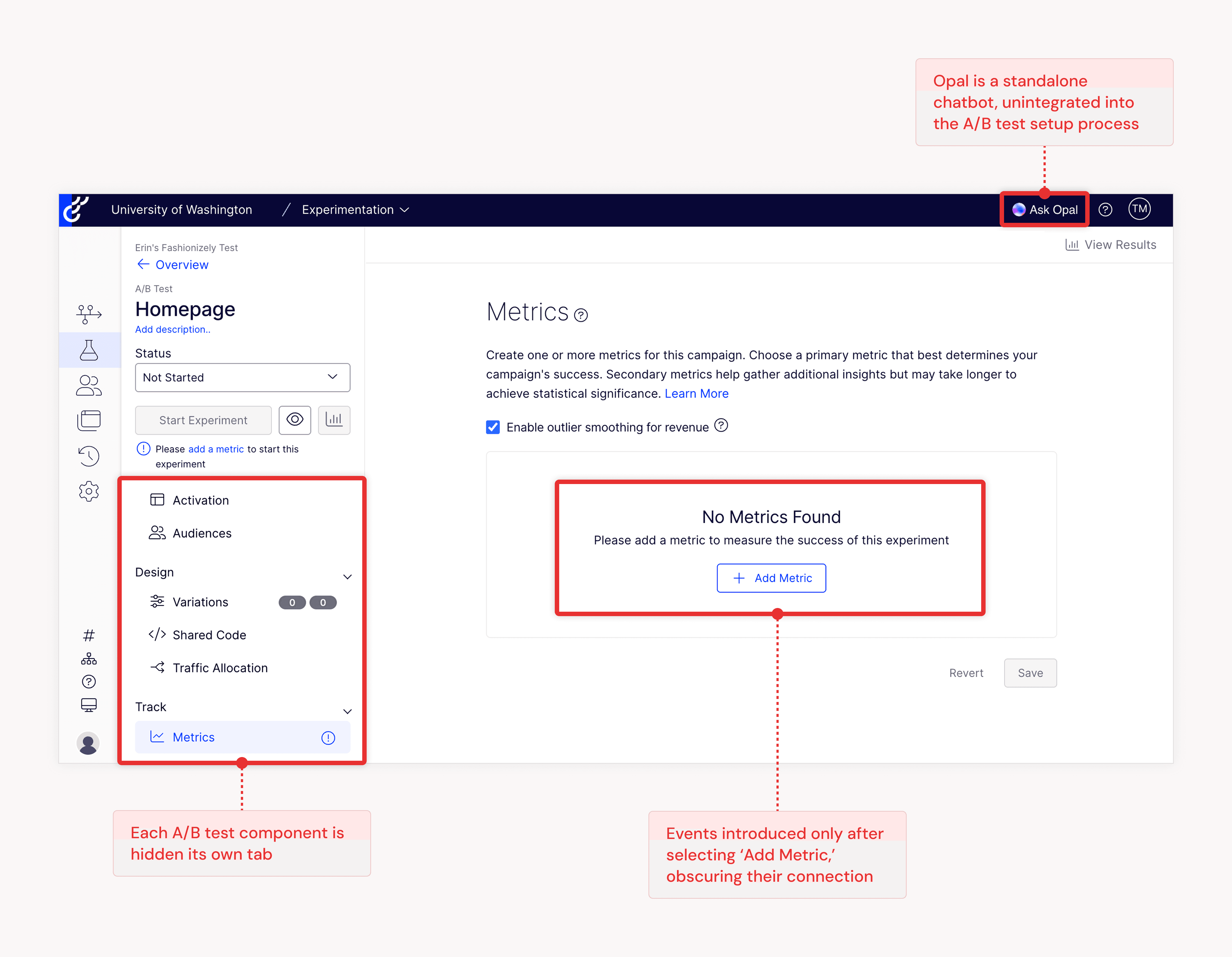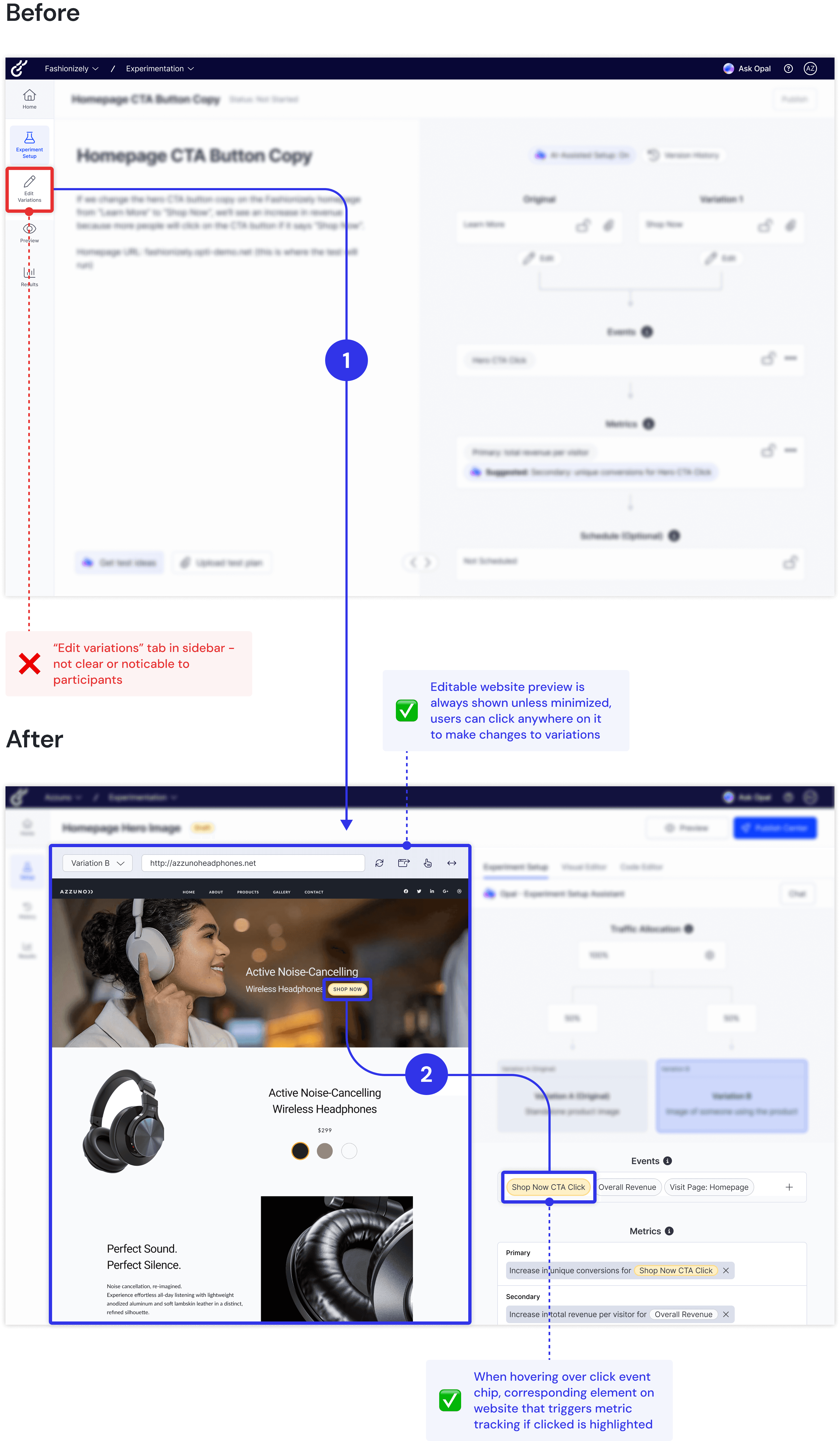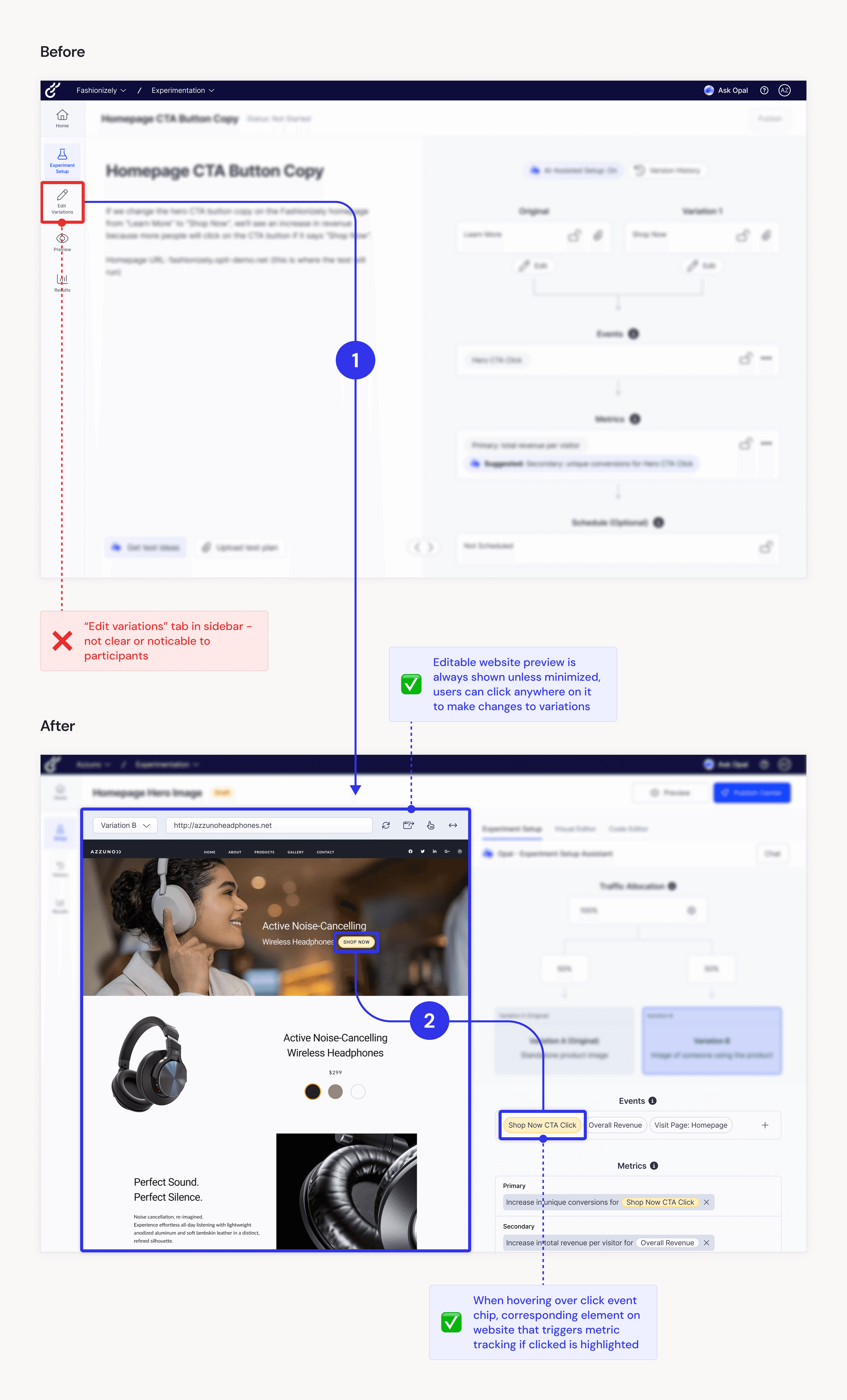Navigating from the “experiment setup” tab to the “edit variations” tab on the left side menu to edit experiment variations didn’t feel clear or natural to participants. Also, while the node layout + nested chips helped participants understand the relationship between events and metrics, they expressed a desire to see where the metric Opal had set up was being tracked on their website and edit if needed.