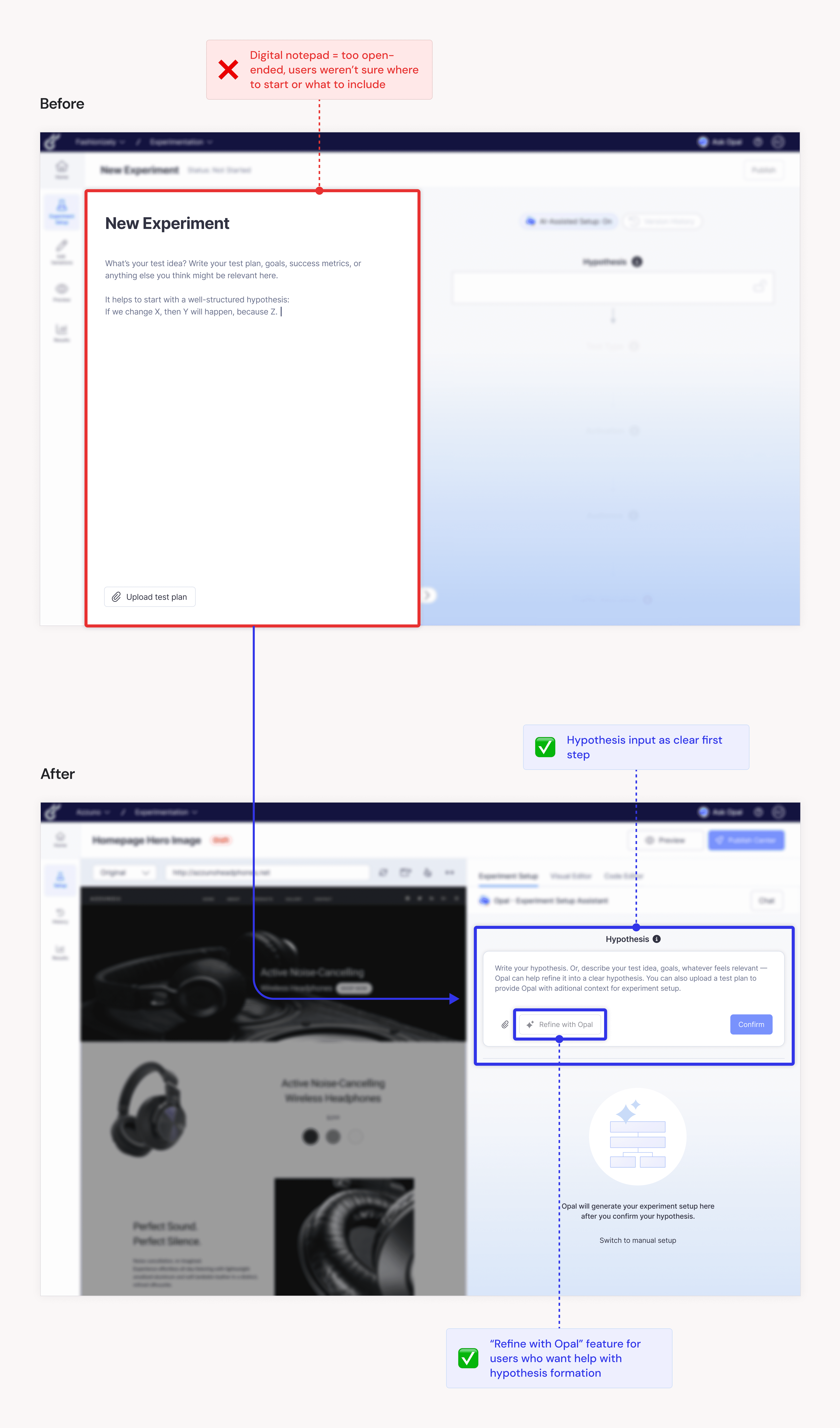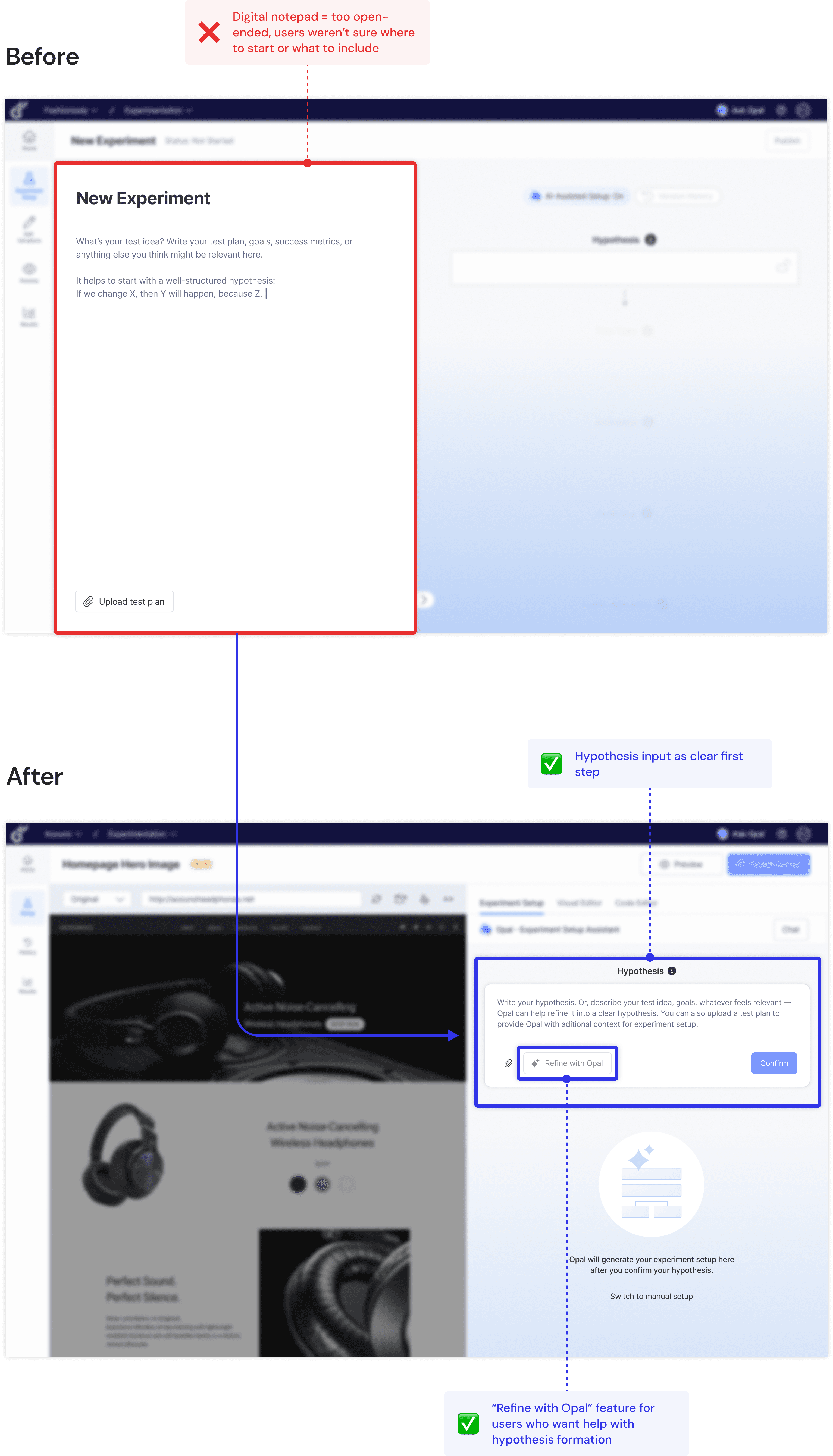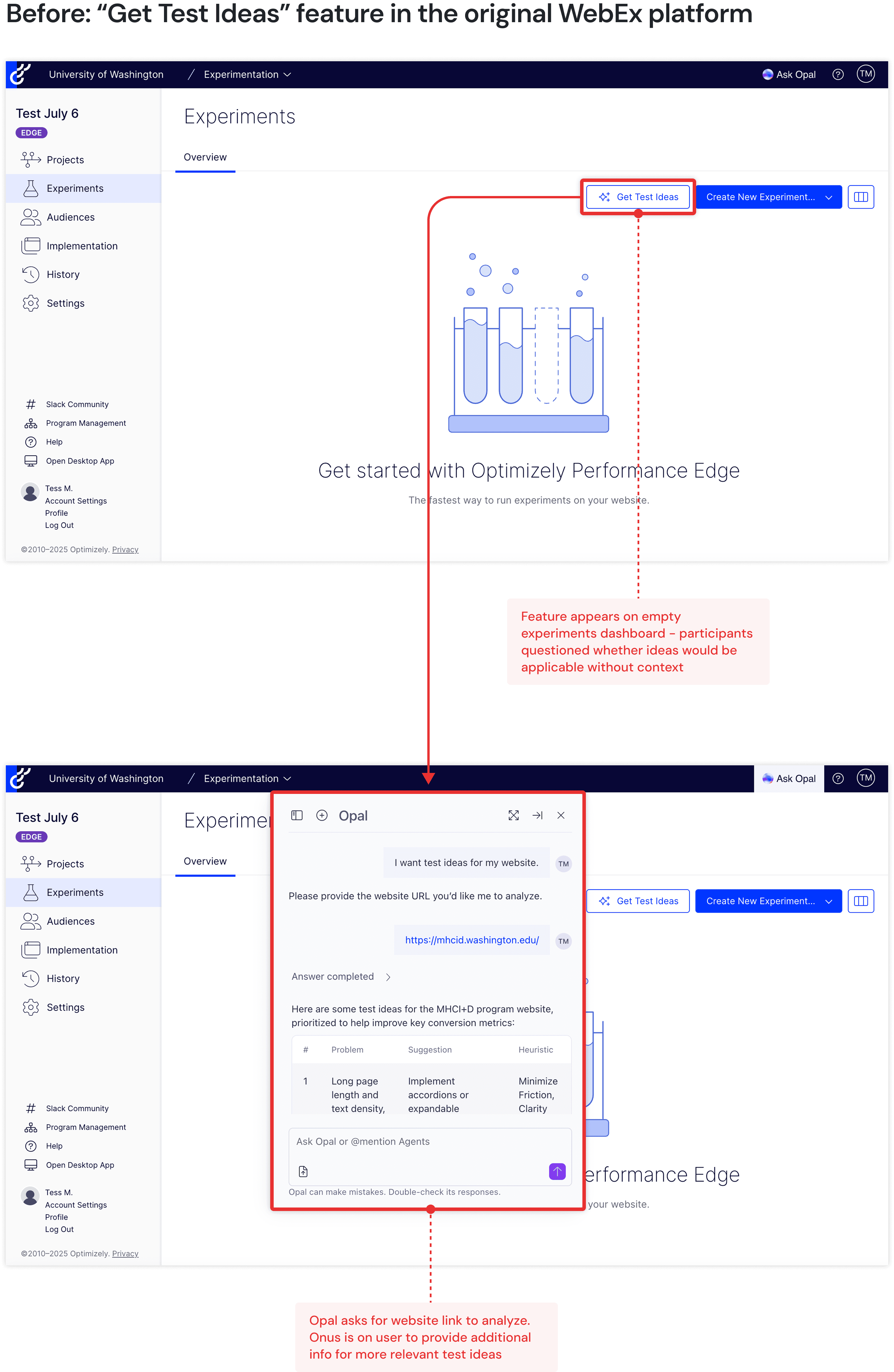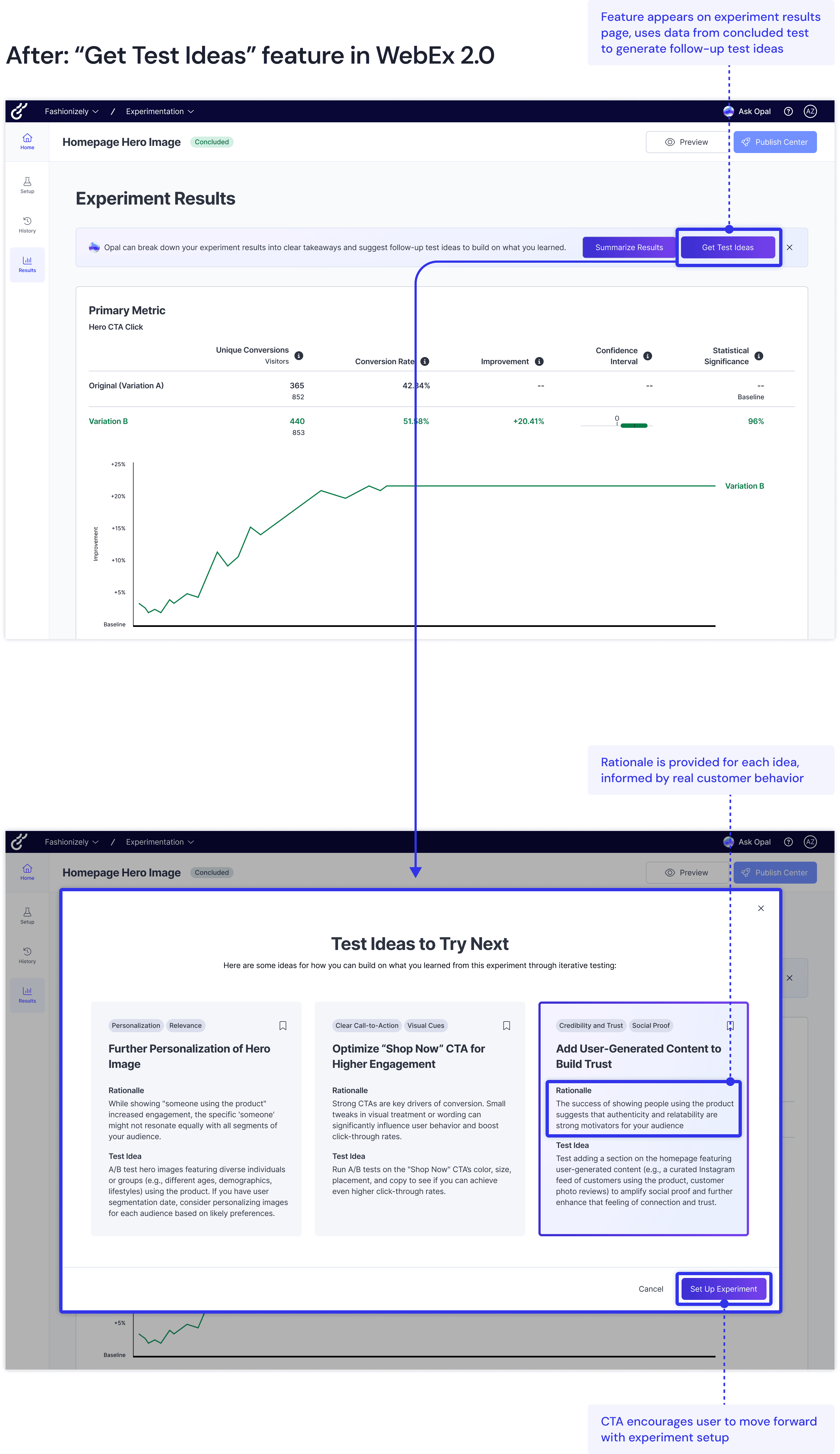 ✅ Improved iteration: Knowing that Optimizely was already rolling out a "get test ideas" Opal-based feature, I considered how best to integrate and expand upon that feature within our redesign. Ultimately, I decided to add it to the A/B test results page, so that Opal could leverage data from the concluded experiment to provide relevant, iterative suggestions for further testing.