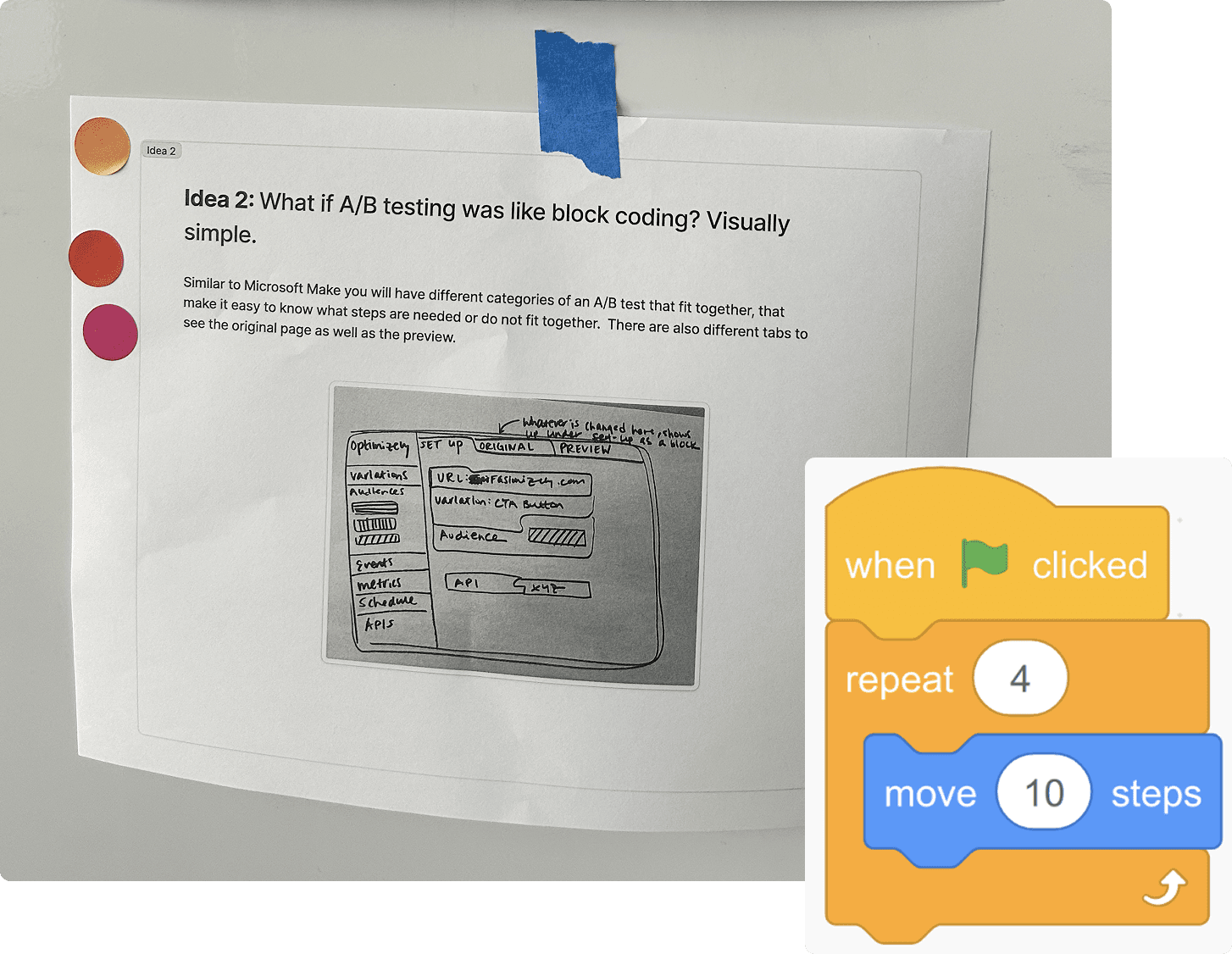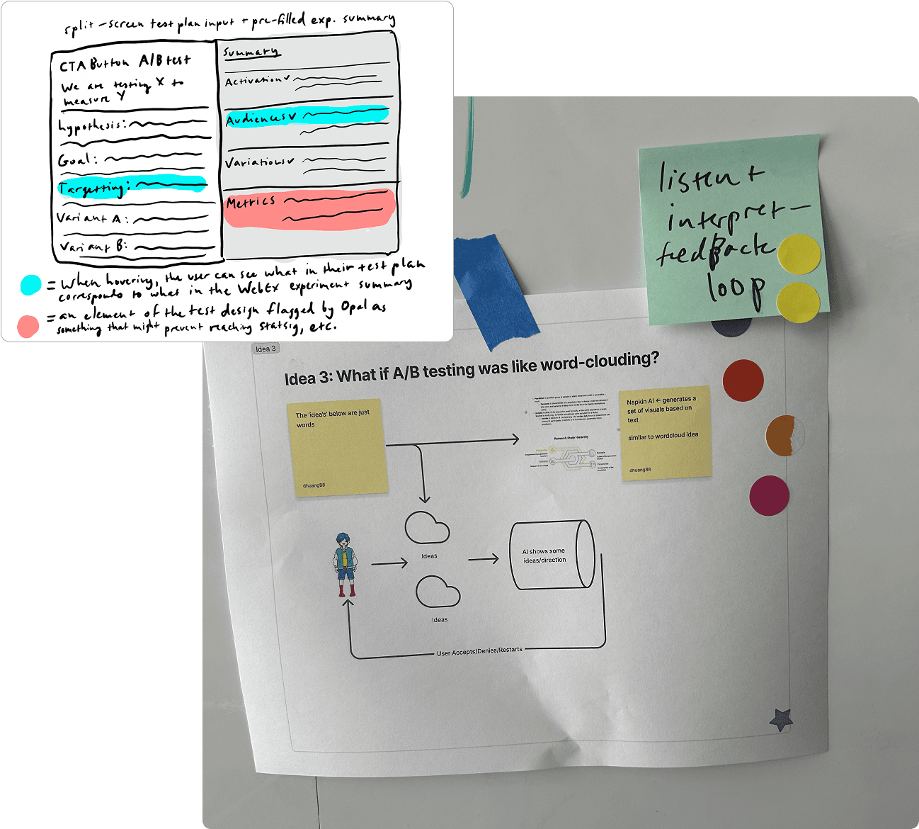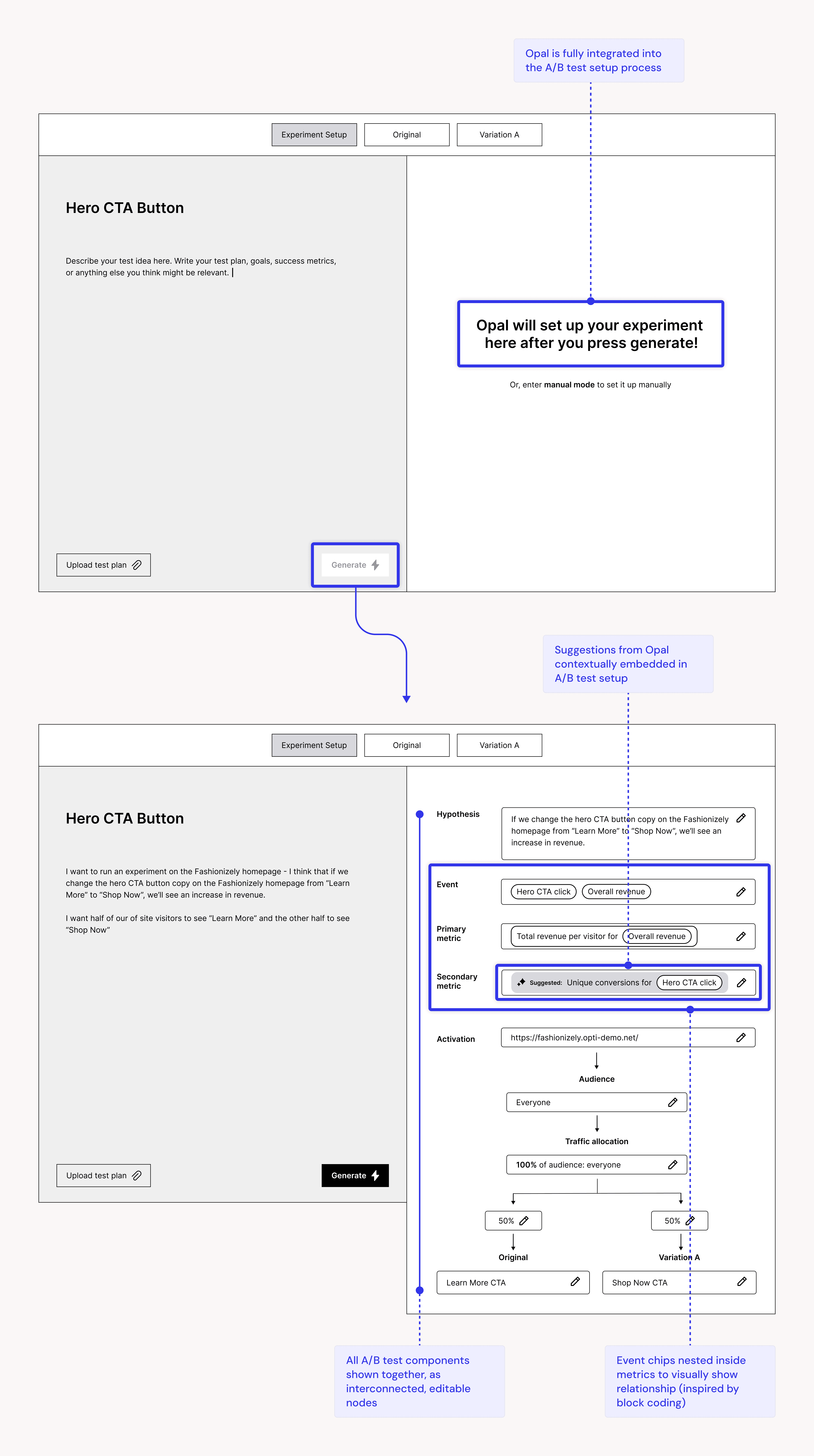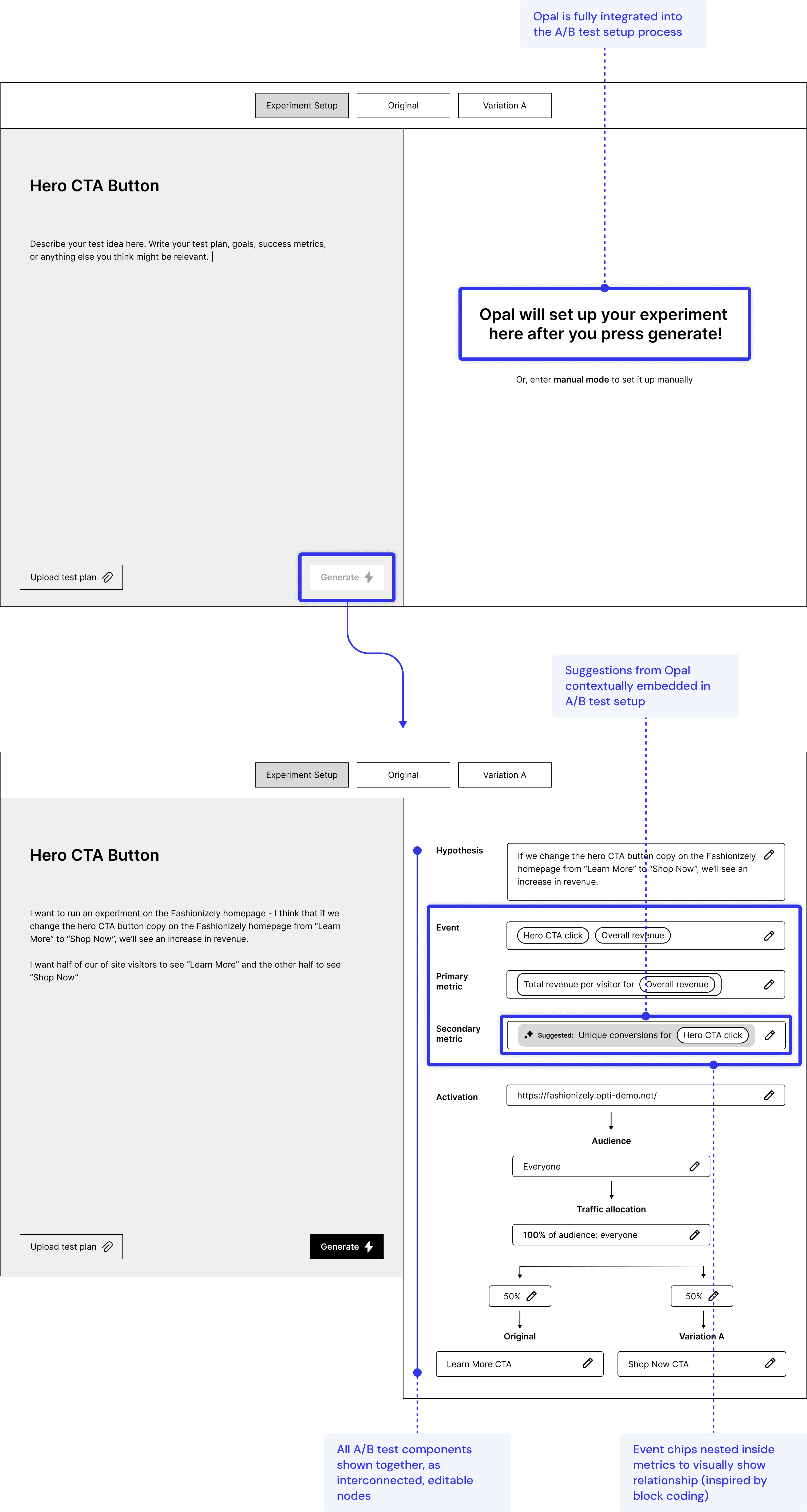 I advocated for combining all three concepts into one, envisioning an experiment setup experience where users describe their test idea in their own words on a digital “notepad” and Opal generates a node-based setup next to their input, with the block coding metaphor used to show the relationship between events and metrics.
