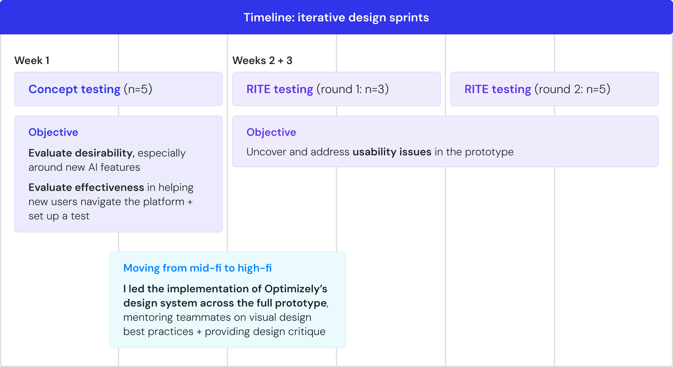 As the sole team member with past experience in visual design, I mentored teammates on design best practices and oversaw the implementation of Optimizely’s design system across the entire high fidelity prototype, driving correct and consistent usage.