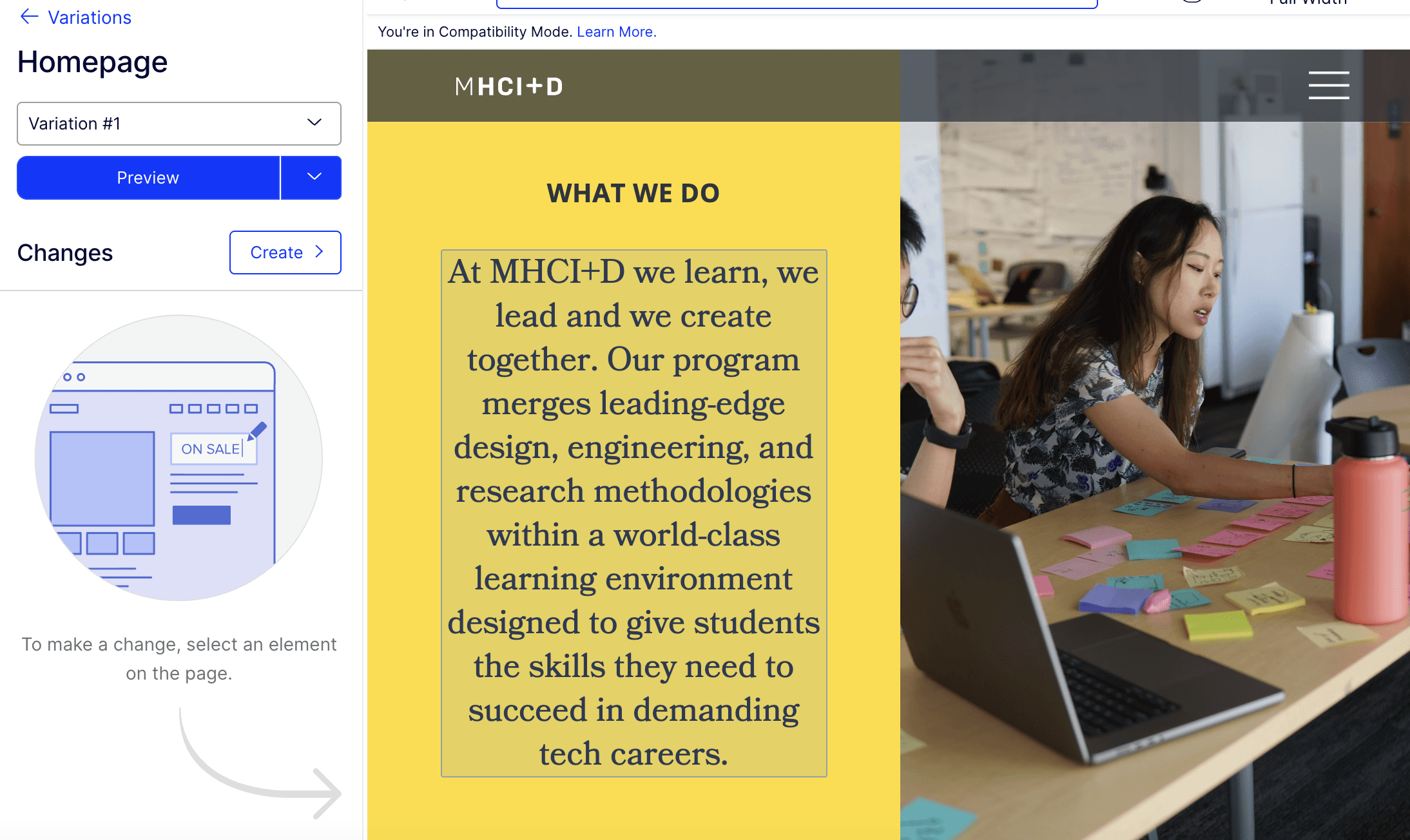 To increase visual clarity, I added an editable website preview to the left side of the experiment setup screen, where the notepad used to be. Users can click anywhere on the website preview to edit variations.